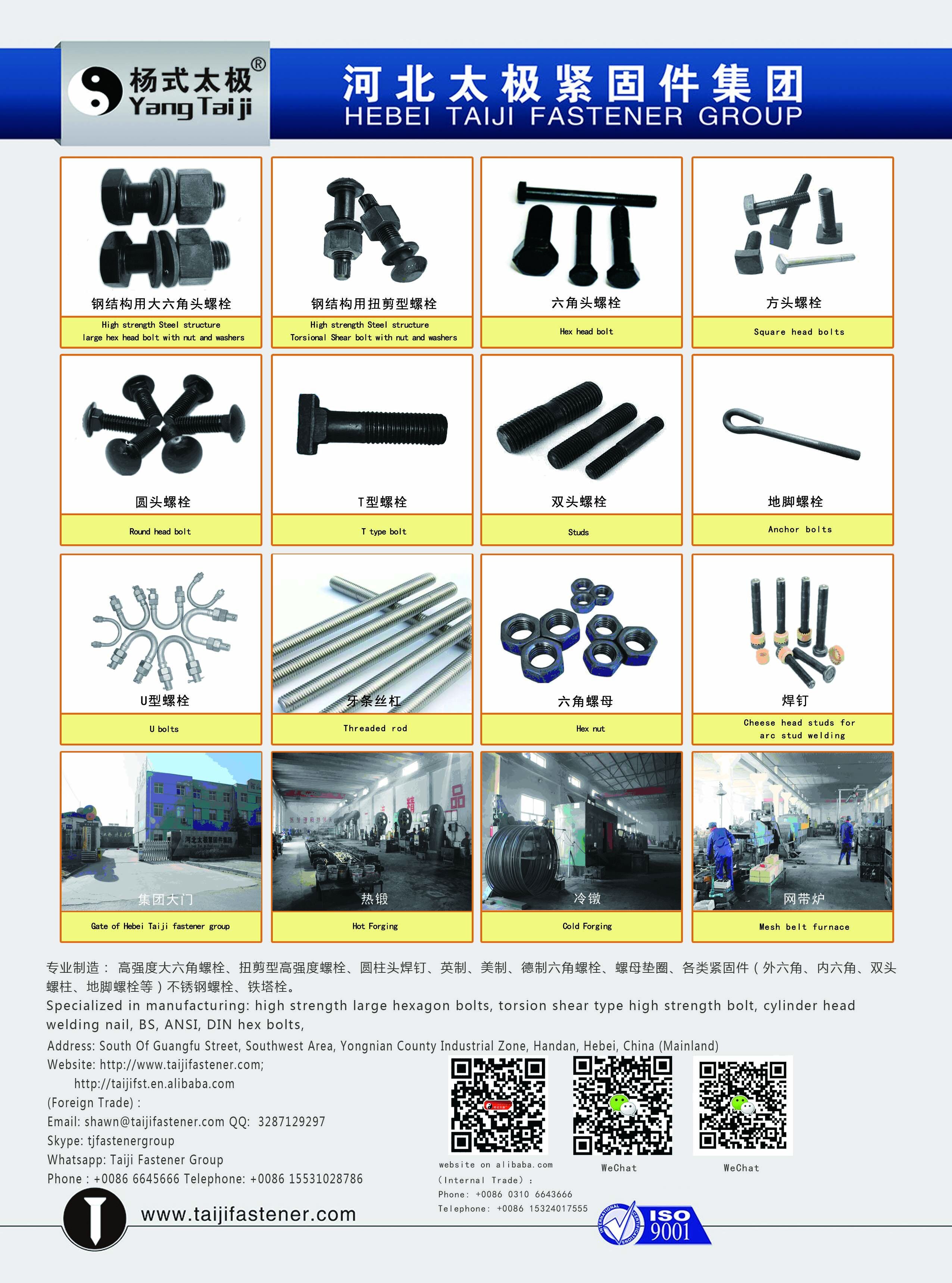 河北太極緊固件集團(tuán)有限公司是鋼結(jié)構(gòu)用高強(qiáng)度大六角頭螺栓、鋼結(jié)構(gòu)用扭剪型高強(qiáng)度螺栓連接副、軌道交通螺栓(四方頭、半圓頭螺栓)、圓柱頭焊釘、雙頭螺栓(化工、石油螺栓A193-B7等等)、鋼軌用高強(qiáng)度魚(yú)尾螺栓、六角螺栓等產(chǎn)品專(zhuān)業(yè)生產(chǎn)的有限責(zé)任公司,公司總部設(shè)在邯鄲,河北太極高強(qiáng)度標(biāo)準(zhǔn)件有限公司擁有完整、科學(xué)的質(zhì)量管理體系。河北太極高強(qiáng)度標(biāo)準(zhǔn)件有限公司的誠(chéng)信、實(shí)力和產(chǎn)品質(zhì)量獲得業(yè)界的認(rèn)可。歡迎各界朋友蒞臨河北太極高強(qiáng)度標(biāo)準(zhǔn)件有限公司參觀、指導(dǎo)和業(yè)務(wù)洽談。 河北太極高強(qiáng)度標(biāo)準(zhǔn)件有限公司始建于1996年,廠區(qū)占地面積35000多平方米,擁有各類(lèi)自動(dòng)化生產(chǎn)及檢測(cè)設(shè)備300余臺(tái)套,采用進(jìn)口及國(guó)內(nèi)大型鋼廠優(yōu)質(zhì)原材料,以現(xiàn)代化企業(yè)制度為運(yùn)營(yíng)機(jī)制,嚴(yán)格按照ISO9001:2008質(zhì)量體系進(jìn)行管理。公司旗下楊氏太極品牌是專(zhuān)業(yè)制造鋼結(jié)構(gòu)用大六角高強(qiáng)度螺栓連接副、鋼結(jié)構(gòu)用扭剪型高強(qiáng)度螺栓連接副、鋼結(jié)構(gòu)球節(jié)點(diǎn)用鋼網(wǎng)架螺栓、焊釘、地腳螺栓、國(guó)內(nèi)外標(biāo)準(zhǔn)各類(lèi)高強(qiáng)度緊固件。經(jīng)北京機(jī)械工業(yè)通用零部件產(chǎn)品質(zhì)量監(jiān)督檢測(cè)中心,天津市建筑工程質(zhì)量檢測(cè)中心,山東大學(xué)材料力學(xué)實(shí)驗(yàn)室等權(quán)威部門(mén)檢測(cè)結(jié)果,全部合格。產(chǎn)品廣泛用于航天,建筑,交通,電力,軍工等行業(yè),并進(jìn)入多個(gè)國(guó)家重點(diǎn)建設(shè)項(xiàng)目工程--奧運(yùn)中心體育場(chǎng),深圳機(jī)場(chǎng),三峽工程,北京植物園,北京地鐵5號(hào)線(xiàn),上海松江經(jīng)濟(jì)開(kāi)發(fā)區(qū)重大項(xiàng)目,南京長(zhǎng)江三橋,武漢長(zhǎng)江二橋等。